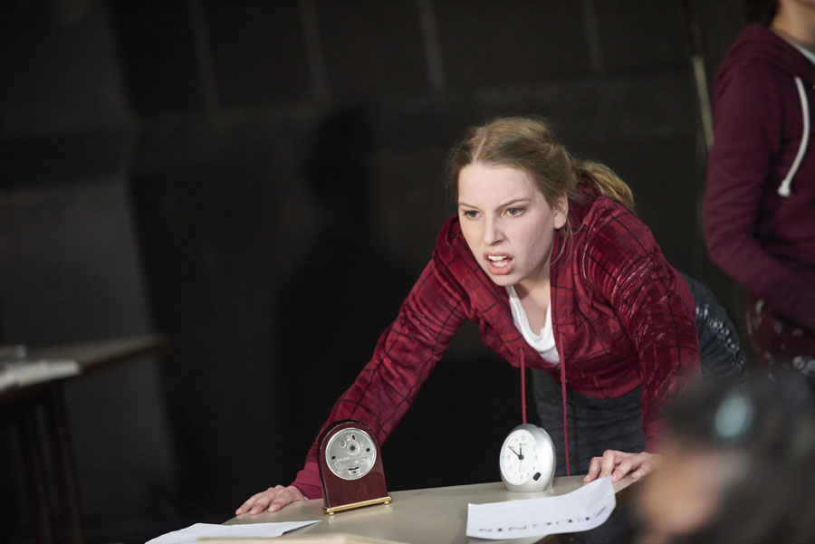 Tick-ticke-tick-ticke-tick: Die Uhr, die Zeit als erstaunliches, bewundertes, ja fast heiliges Gut wird hoch gehalten und weitergereicht. Doch die Uhr läuft, auch die Schülerinnen und Schüler rennen, ein Wettlauf gegen die Zeit und gegeneinander beginnt. Elektro-Beats wummern, während sich die Schüler Wissen in den Kopf hämmern, ein schweißtreibender Wettkampf, Hochleistungssport, bis sie außer Atem eine kurze Pause einlegen - um sich gleich darauf selbst ohrfeigend zu noch mehr Leistung anzutreiben.