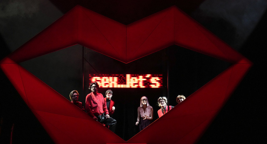 Die Bühne ist in sinnlich glühendes Rot getaucht; kantig stilisierte große Lippen stehen im Mittelpunkt. Aus ihnen treten die Darsteller hervor, erst einmal auch ganz in Rot, später dann auch mal mit Tiermaske. Gilbert Mieroph tritt auf als Super-Nerd mit besonders dicker Hornbrille. Dennis Junge und Stephan Weber, auf der Bühne auch als Instrumentalisten unterwegs mit Gitarre, Schlagzeug, Keyboards, wirken wie eine Wiederauferstehung von Modern Talking.