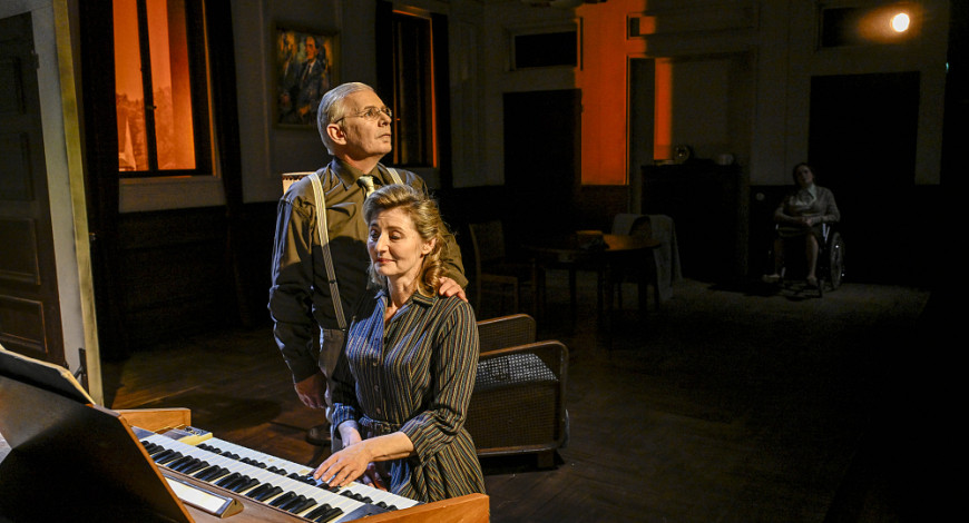 Das eigenartige Geschwistertrio vervollständigt im Rollstuhl die querschnittsgelähmte Clara (Susanne Weckerle), der als „Opfer des amerikanischen Bombenterrors“ in den letzten Kriegstagen ein Dachbalken das Rückgrat zertrümmert hatte. Sie ist für ihre Geschwister ein wenig von linken Lesefrüchten vergiftet und von Undank geprägt und zieht so schon viel unterschwelligen Hass oder auch mal offene Ausbrüche – sehr präzise kalkuliert vom Autor – auf sich. Sie kann aber auch ganz gut zurückgeben. So, wie man sie damals gewiss nicht als lebensunwertes Leben und unnütze Esserin ins Gas geschickt hätte, weist man im ehrenwerten Geschwisterhaus nun weit von sich, ihrer alltäglichen Last auch nur im Sanatorium entledigen zu wollen.